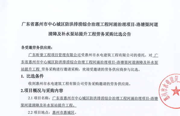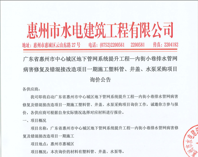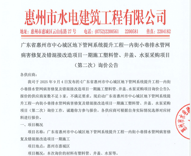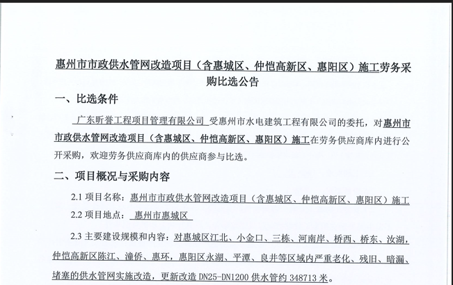 廣東省惠州市中心城區(qū)地下管網(wǎng)系統(tǒng)提升工程-內(nèi)街小巷排水管網(wǎng)病害修復(fù)及錯(cuò)混接改造項(xiàng)目一期施工勞務(wù)采購比選公告……